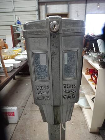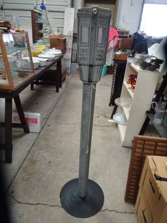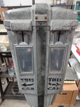 For sale is a 2 space/dual parking meter. It has coin slots on 2 sides so it could give time to two spaces. The meter does not have the mechanism inside but can receive coins like a coin bank. It has key that allows you to access the inside. Neat standalone piece that is hard to find. Made of cast aluminum on free standing base. Only $95