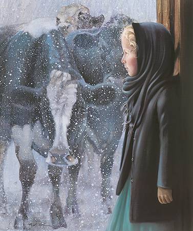 "December" features a sweet Amish girl, looking out into the December snow accompanied by several cows.