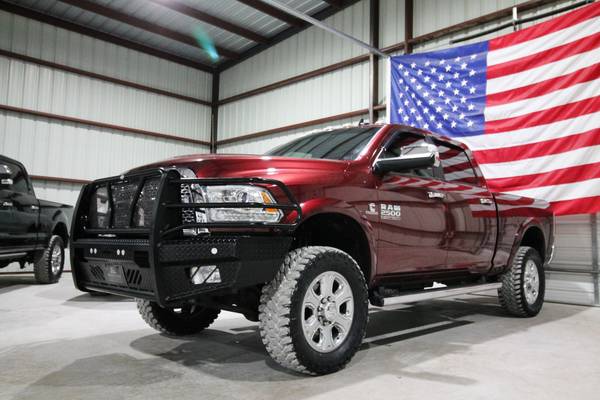This 2018 RAM 2500 Laramie 4x4 is a well-kept Texas truck powered by the 6.7L Cummins Turbo Diesel paired with an automatic transmission and electronic four-wheel drive, showing 183k miles with two owners, a clean Carfax, and great documented service history. It has been locally owned and maintained, sits leveled on brand-new 35” mud-terrain tires, and features a Frontier full replacement front bumper, factory projector headlights, factory LED tail lights, and a B&W gooseneck hitch, all finished in beautiful Delmonico Red Pearl paint. The interior is clean and odor-free with black leather, dual power heated and cooled seats, a heated steering wheel, fixed center console, factory touchscreen radio, dual climate control, passive keyless entry with push-button start, built-in trailer brake, power windows, and power locks, making this Laramie a sharp, comfortable, and capable truck ready for work or daily driving.