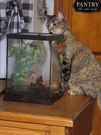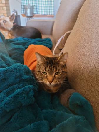 Almost 2 year old female cat. Spayed and front claws removed. Comes with litterbox, kitty litter, partial bag of Hills Science Diet food and small cans of same in soft food. Must be an only cat. She's only been raised with small dogs so she thinks she's a dog and hates cats. 3 dogs and a cat inside is a little much. She's never been around big dogs. She has to be an indoor cat. We lock her up in her room at night (laundry room) and she's totally okay with that. She's VERY affectionate. Lap cat. You have an electric blanket on you and she'll stay all day. Spoiled completely rotten! lol Serious inquiries only.