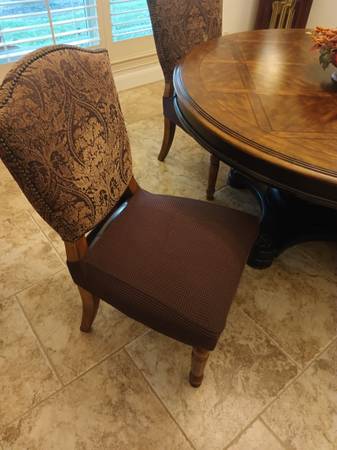 Dining Table 56" Round with 5 chairs with black pedestal base. All chairs are covered with fitted covers due to slight cracking in faux leather on 3 of the chairs. Table in excellent condition. Asking $200 or best offer.