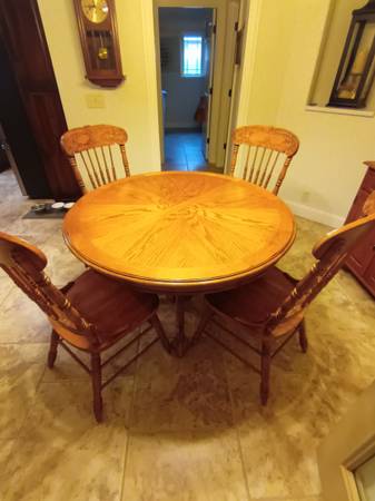 Oak claw foot 46" round table has 36" leaf and 4 high back chairs. Excellent condition with only small nicks around the claw feet.
