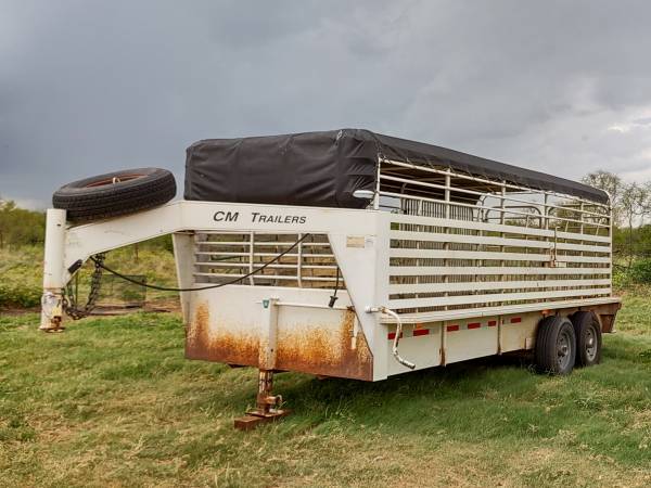 2005 tubing side tarp top gooseneck CM livestock trailer for sale. 20' long x 6'8" wide. Torsion axles, one cut gate, butterfly tail gates, good floor, good lights, and good 14 ply tires. $8500...