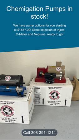 I have brand new Inject-o-meter and Neptune fertilize and chemigation pumps available in stock here at Direct Pivot Parts in Hart, TX.