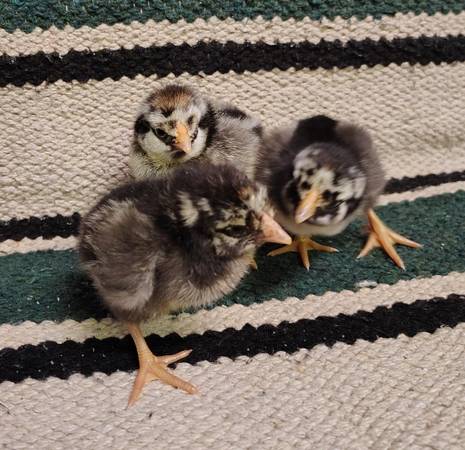 Assorted breeds of chicks - Silver-laced Wyandottes, Black Copper Marans, Easter Eggers, Speckled Sussex, Buff Orpingtons. Ages range from 1 week old to 6 weeks old, prices start at $4.50 each and up according to age. Discounts for quantity (806- three three four- o777)
