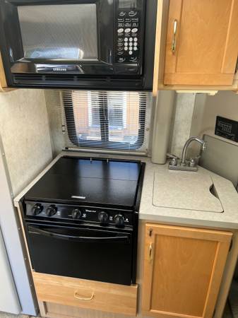Featuring a full kitchen with a 3-burner stove with oven, sink, microwave, and 2.7 CuFt Norcold refrigerator with freezer.