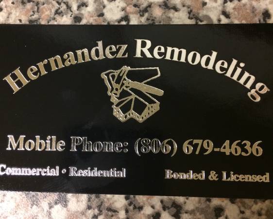 HERNANDEZ REMODELING ,Thank you for your interest in my company. We are specialized from a simple repair to more extensive projects or new construction . We specialize in CUSTOM HOMES and HOME ADDITIONS. KITCHEN and BATH remodels, CABINETS, PAINTING,TEXTURING, TILE, FENCES, SIDING ,ROOFING, INSULATION and METAL BUILDINGS, also CONCRETE ,FOUNDATIONS, DRIVEWAYS, and PATIOS ,PORCH COVERS. LICENSED and BONDED !!! FREE ESTIMATES !!! IF YOU CAN DREAM IT WE CAN BUILD IT !!! 806-679-4636 FRANK